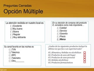 Tipos de preguntas en un cuestionario de encuesta. Estaría de acuerdo que la universidad implemente una unidad que proporcione souvenirs, materiales académicos e inclusive uniformes. Se produce un movimiento en el que interviene el aparato locomotor o las vísceras.