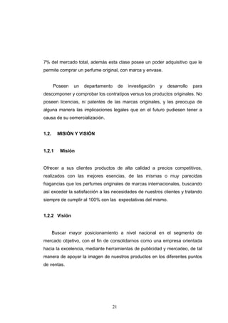 Misión y visión 1.2.1 misión ofrecer a sus clientes productos de alta calidad a precios competitivos, realizados con las mejores esencias, de las mismas o muy parecidas fragancias que los perfumes originales de marcas internacionales, buscando así exceder la satisfacción a las necesidades de nuestros clientes y tratando siempre de cumplir al 100% con las.