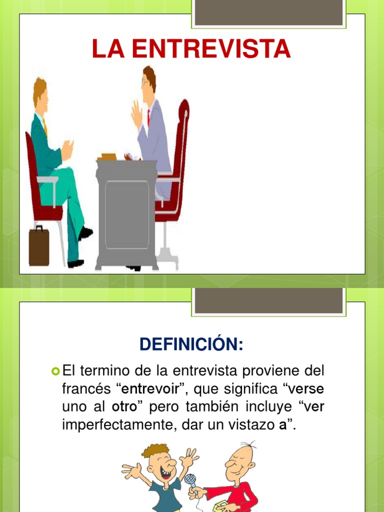 Es frecuente al momento de buscar un empleo, que el mismo esté compuesto por una o varias entrevistas previas al ingreso en una empresa. Entrevista la palabra entrevista está compuesta de entre (del latín inter) y vista (del latín, derivada del verbo videre = ver). A la entrevista (general), conversación estructurada en la que un participante hace preguntas y el otro proporciona respuestas;