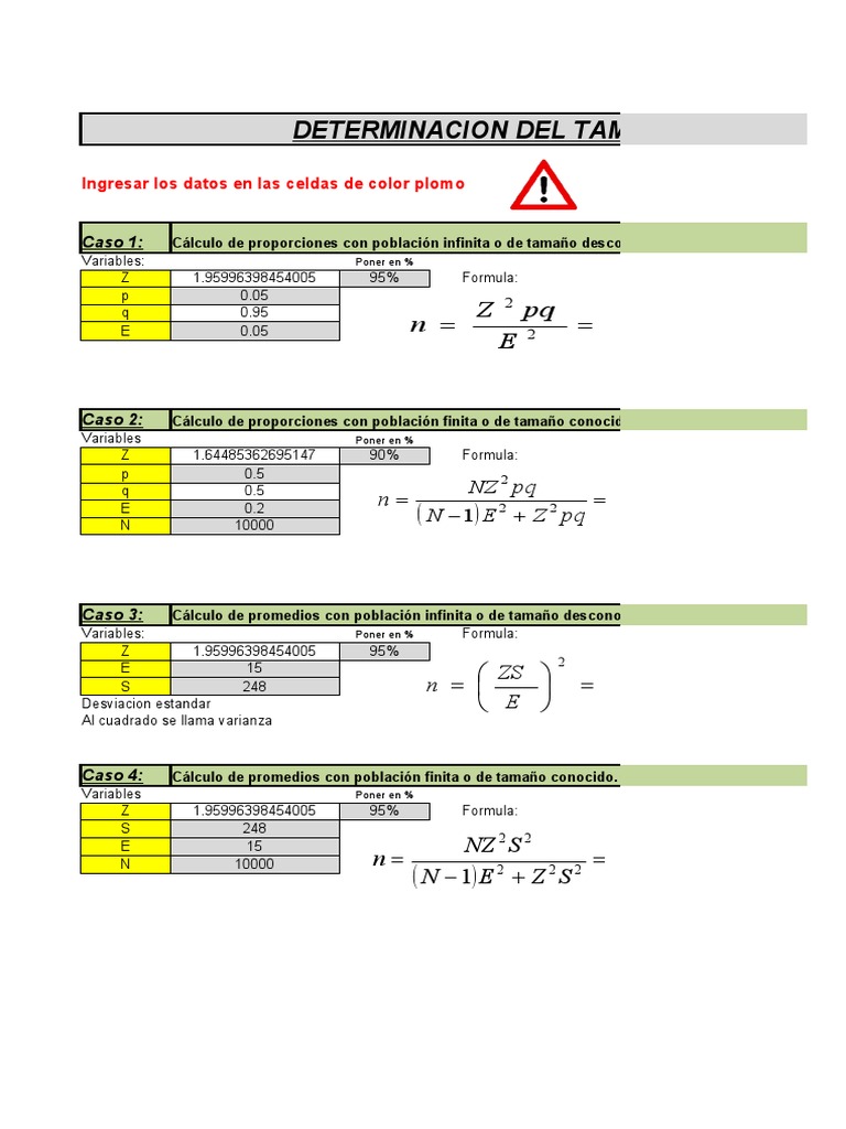 Una vez que tengas un marco de muestreo (los posibles encuestados) en excel, podrás seleccionar fácilmente una muestra aleatoria entre ellos. Cálculo de proporciones con población finita o de tamaño conocido. Determinacion del tamaño ingresar los datos solo en las celdas de color verde caso 1: