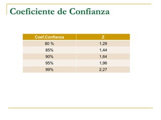 En estadística, la desviación estándar es una medida de la cantidad de variación o dispersión de un conjunto de valores. El coeficiente de confianza indica la cantidad de errores estándar que está dispuesto a sumar y restar a la medida para tener un cierto nivel de confianza en los resultados.