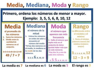 Además de la media existen otras medidas: La media, la mediana y la moda se definen de la siguiente manera: Se suman todos los datos y se divide por la cantidad de datos, en este caso por 10.